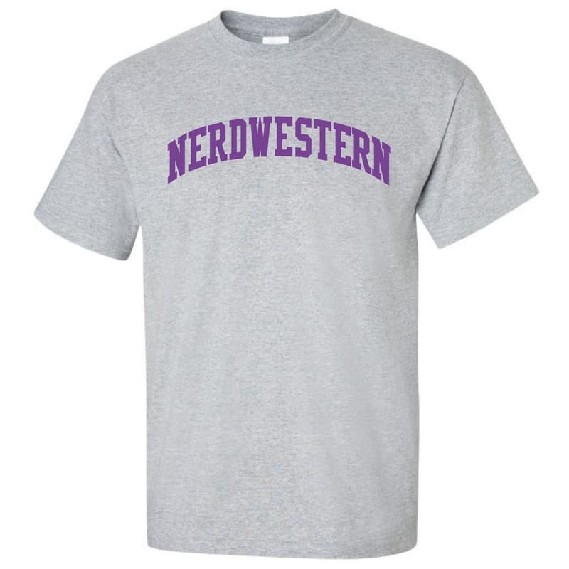 Adult Grey Short Sleeve Tee Shirt with “Nerdwestern” Design