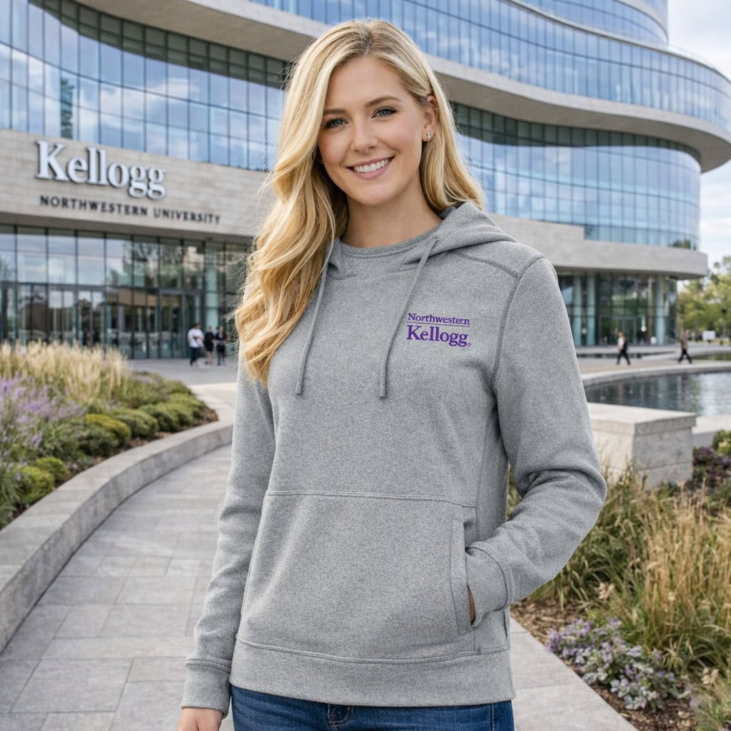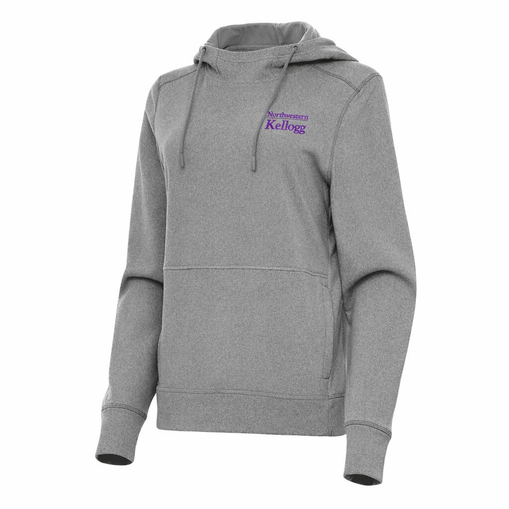 Northwestern I Kellogg Women’s Antigua Justice Supersoft Pullover Hooded Sweatshirt in Light Black Heather Color