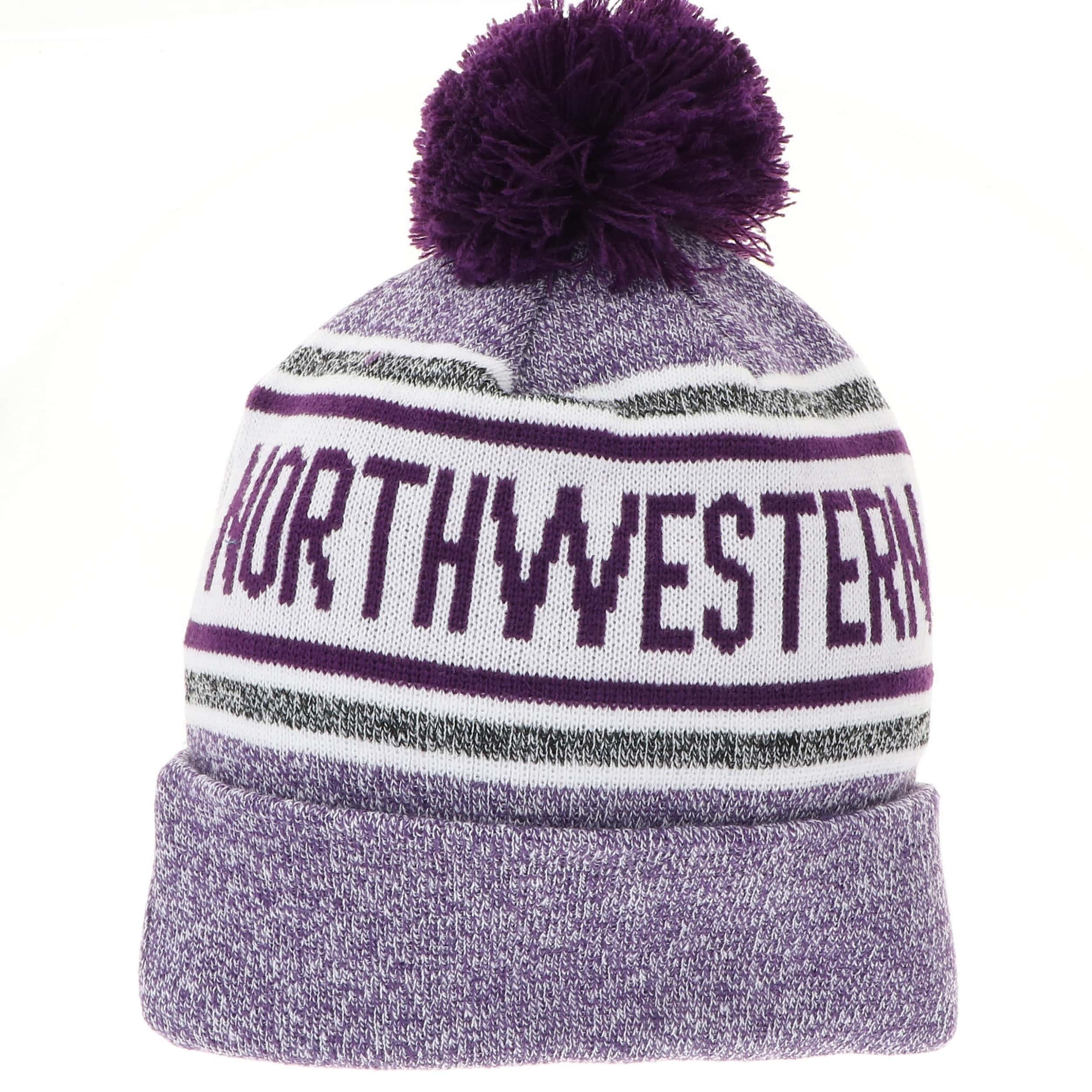 Northwestern University Wildcats Adult Purple Marled Cuffed Stripped Northwestern Knit Cap with Pom