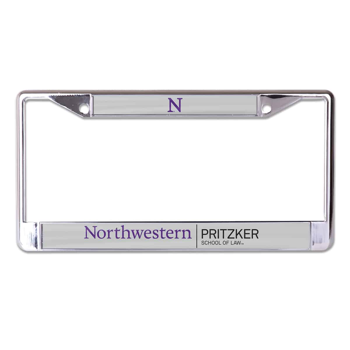 Northwestern University Wildcats Chrome License Plate Frame with Laser Cut Grey Insert & Pritzker School of Law Design