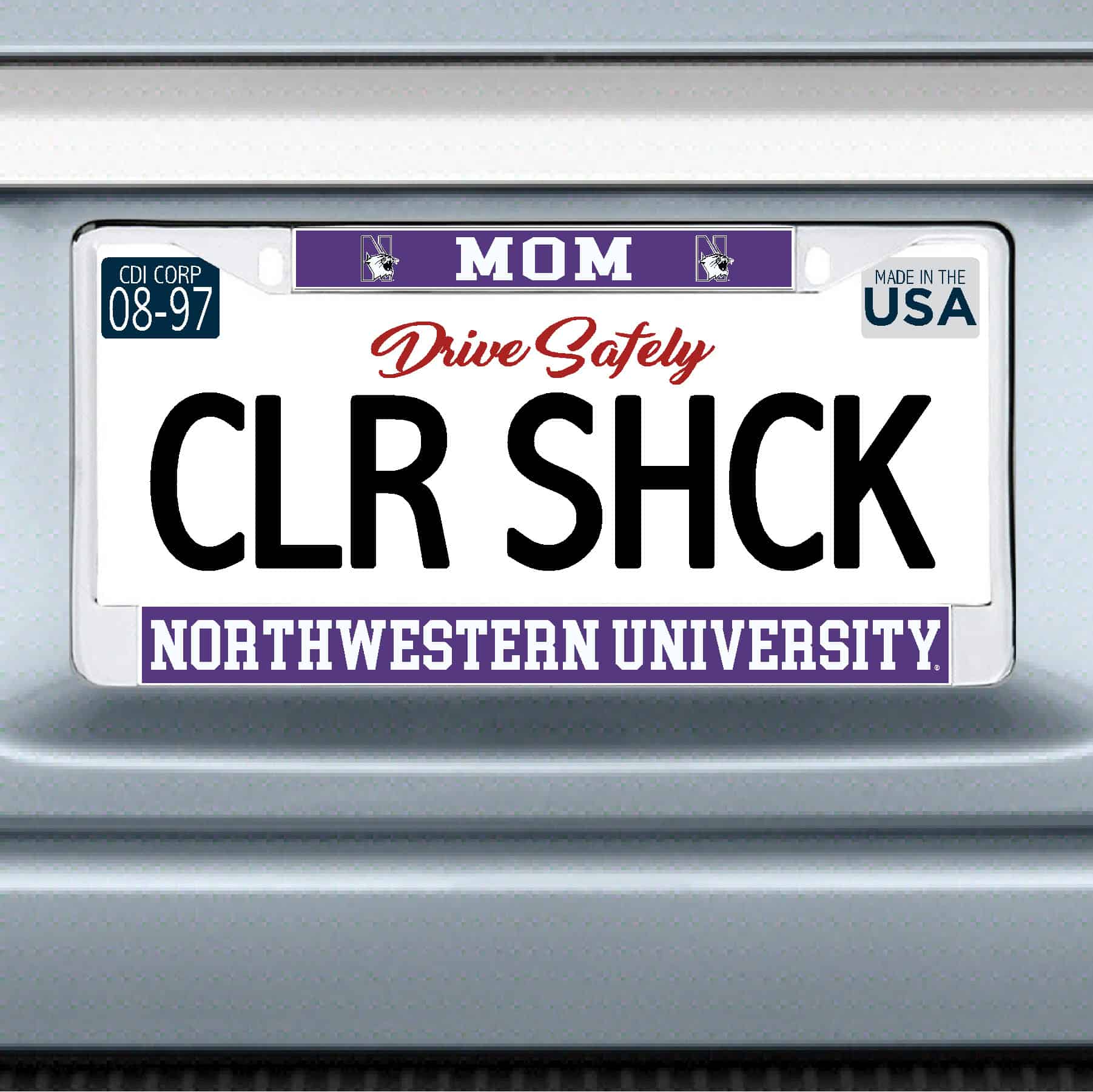 Northwestern University Wildcats Chrome License Plate Frame with Purple Laser Cut Insert MOM/NORTHWESTERN UNIVERSITY Design