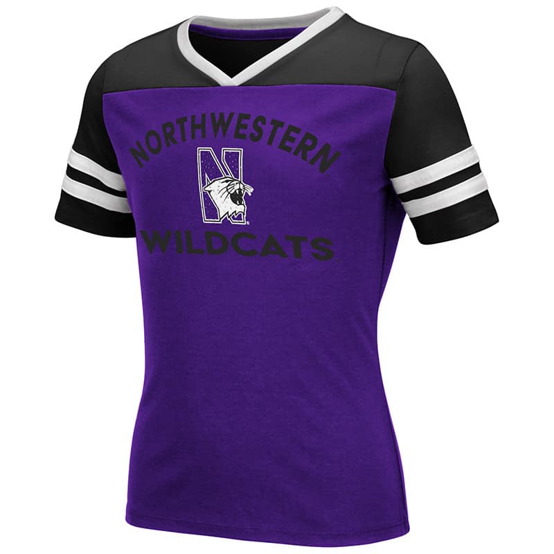 Northwestern University Wildcats Colosseum Girls Faboo Rhinestone V-Neck S/S Tee with N-Cat Design