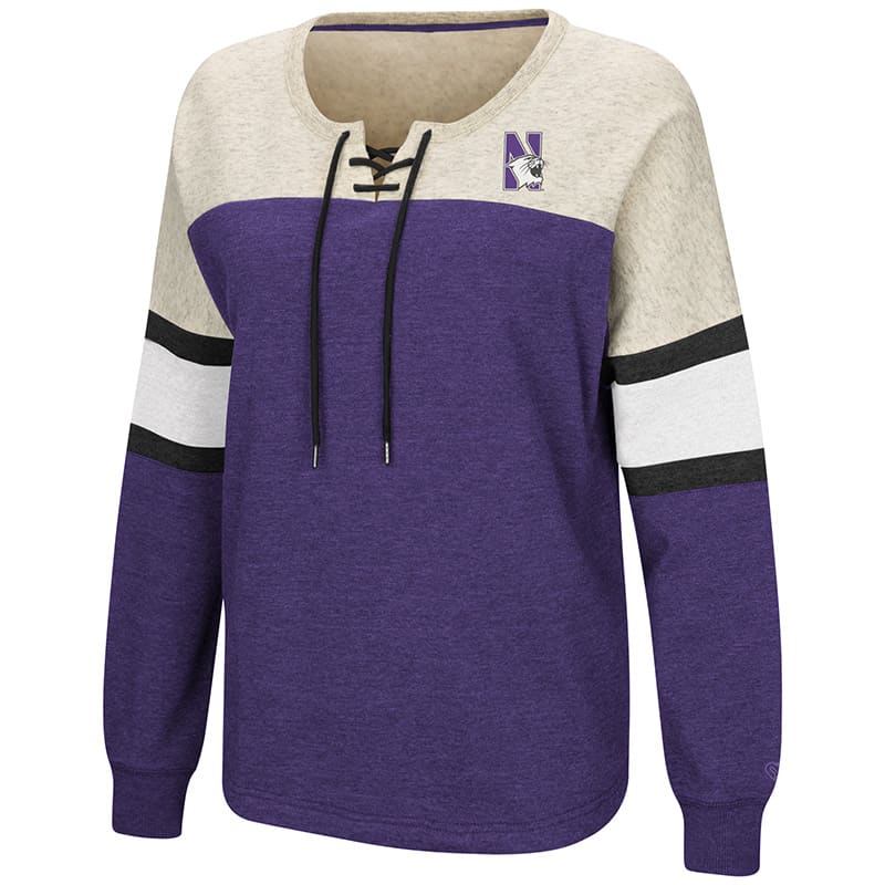 Northwestern University Wildcats Colosseum Ladies Purple/Heather Grey Become Great Oversized Lace Up P/O with N-Cat Design