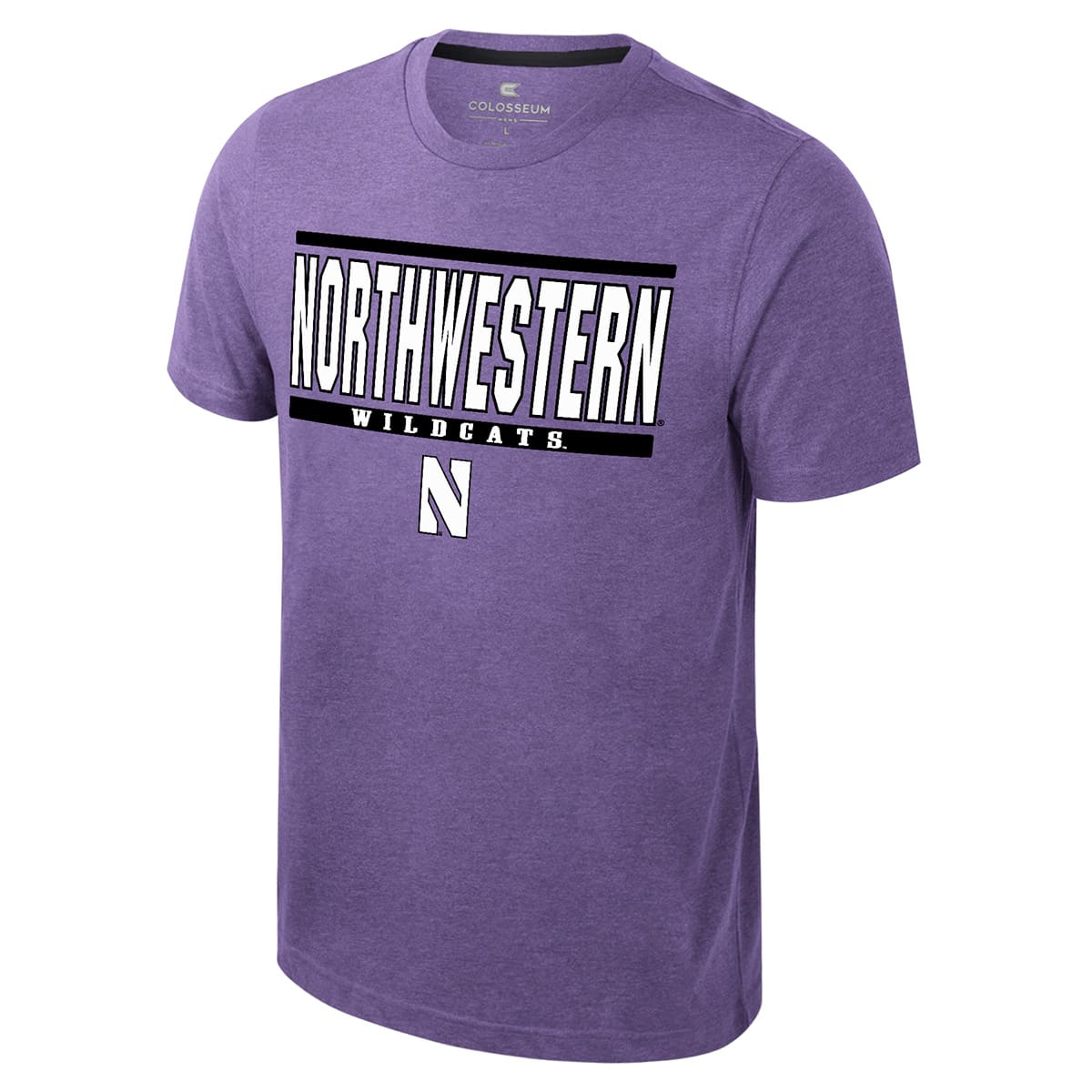 Northwestern University Wildcats Colosseum Men’s Ben Dual Blend Heather Purple S/S Tee With Straight Northwestern Design