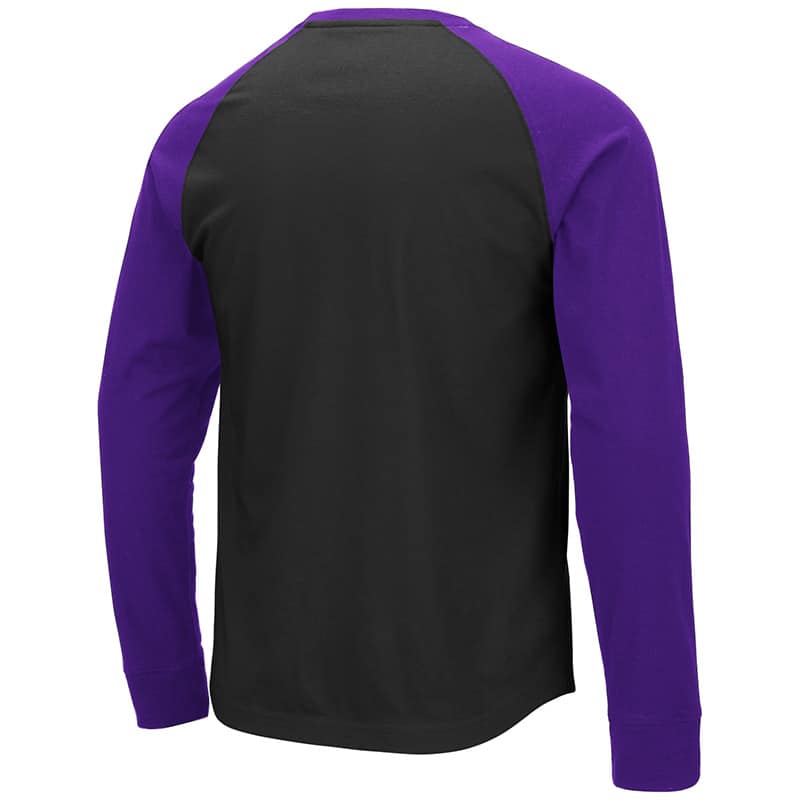 Northwestern University Wildcats Colosseum Men’s Black/Purple Raglan Baseball L/S T-Shirt with Stylized N-Cat Design