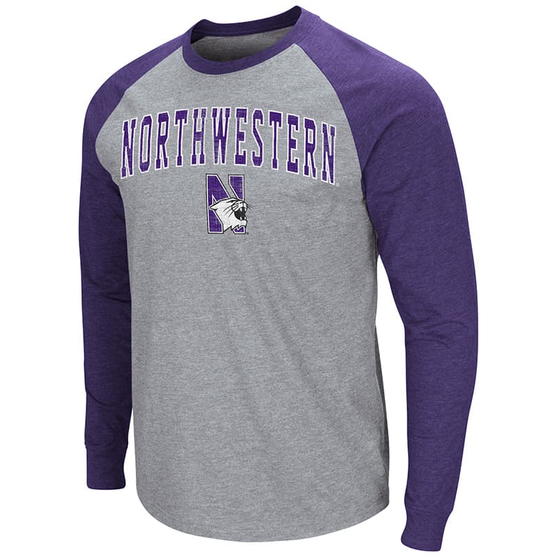 Northwestern University Wildcats Colosseum Men’s Heather Grey/Purple Raglan L/S T-Shirt with Arched Northwestern & N-Cat Design