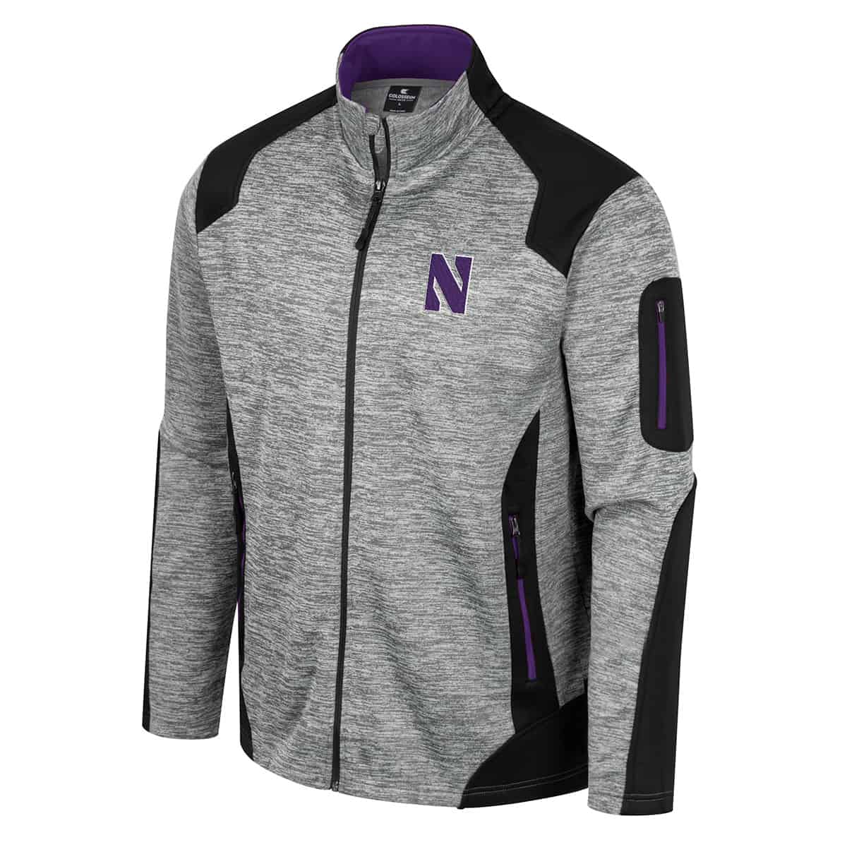 Northwestern University Wildcats Colosseum Men’s Silberman Full Zip Color Block Jacket Color: Nickel Grey / Black / Purple Details: Side Zippered Pockets, Media Pocket, Pop Color Accents Fabric: 100 Polyester…