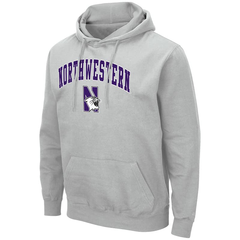 Northwestern University Wildcats Colosseum Men’s Silver Hooded Sweatshirt With Appliqué Embroidered Arched Northwestern Over N-Cat Design