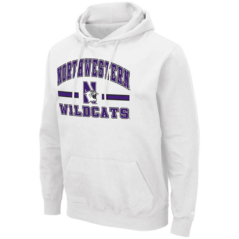 Northwestern University Wildcats Colosseum Men’s White Hooded Sweatshirt With Appliqué Embroidered Northwestern Over N-Cat Bar Design