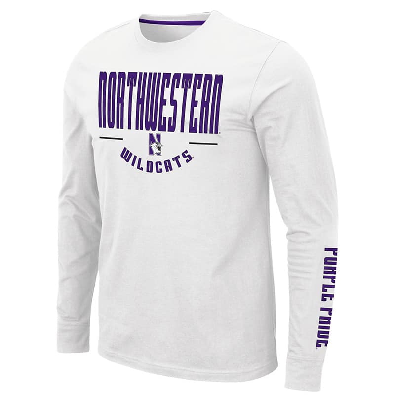 Northwestern University Wildcats Colosseum Men’s White Streepurplear L/S T-Shirt with Northwestern & N-Cat Design