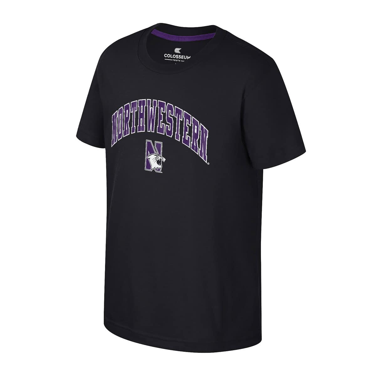Northwestern University Wildcats Colosseum Youth Kril Black S/S Tee with Arch Northwestern Over N-Cat Design