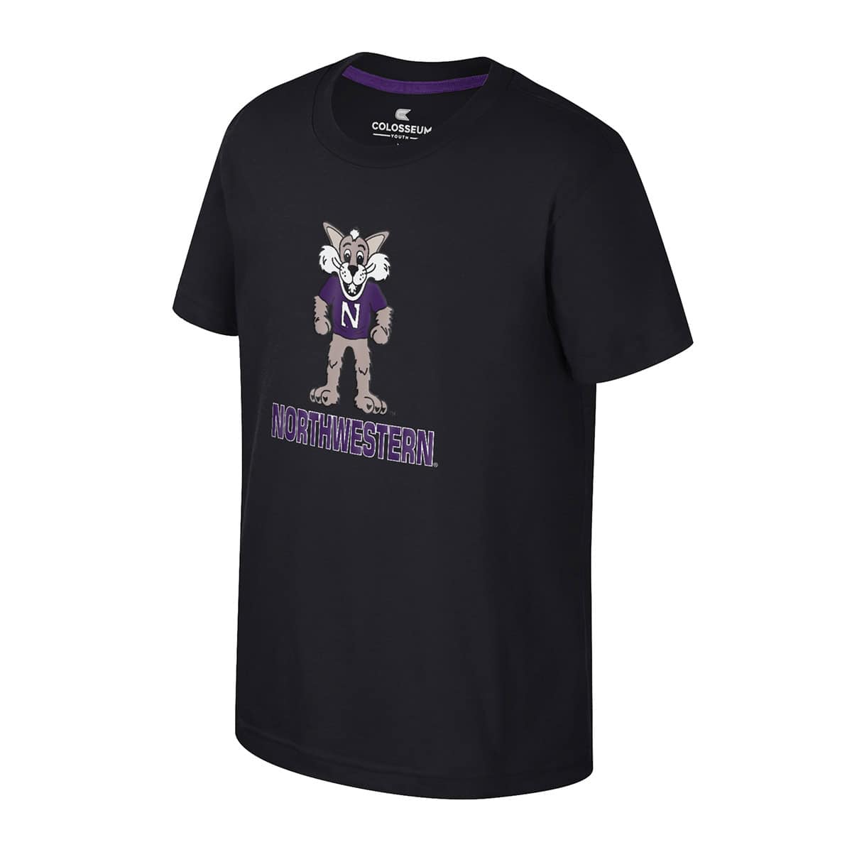 Northwestern University Wildcats Colosseum Youth Kril Black S/S Tee with Willie Over Northwestern Design
