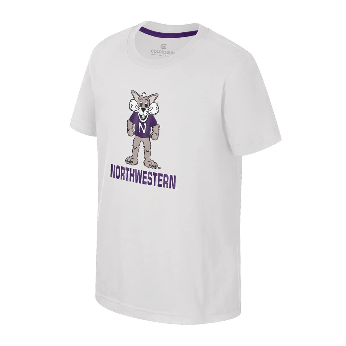 Northwestern University Wildcats Colosseum Youth Kril White S/S Tee with Willie Over Northwestern Design