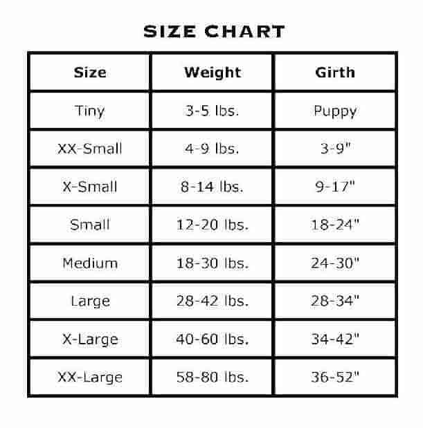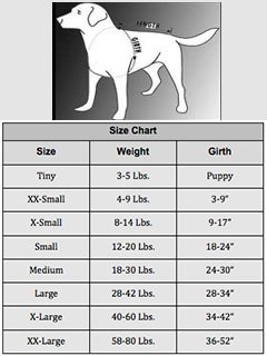 | Size | Tiny (3-5 lbs, Puppy), XX-Small Dog (4-9 lbs, 3-9), X-Small Dog (8-14 lbs, 9-17), Small Dog (12-20 lbs, 18-24, Medium Dog (18-30 lbs, 24-30), Large Dog (28-42 lbs, 28-34), X-Large Dog (40-60 lbs, 34-42), XX-Large Dog (58-80 lbs, 36-52) |