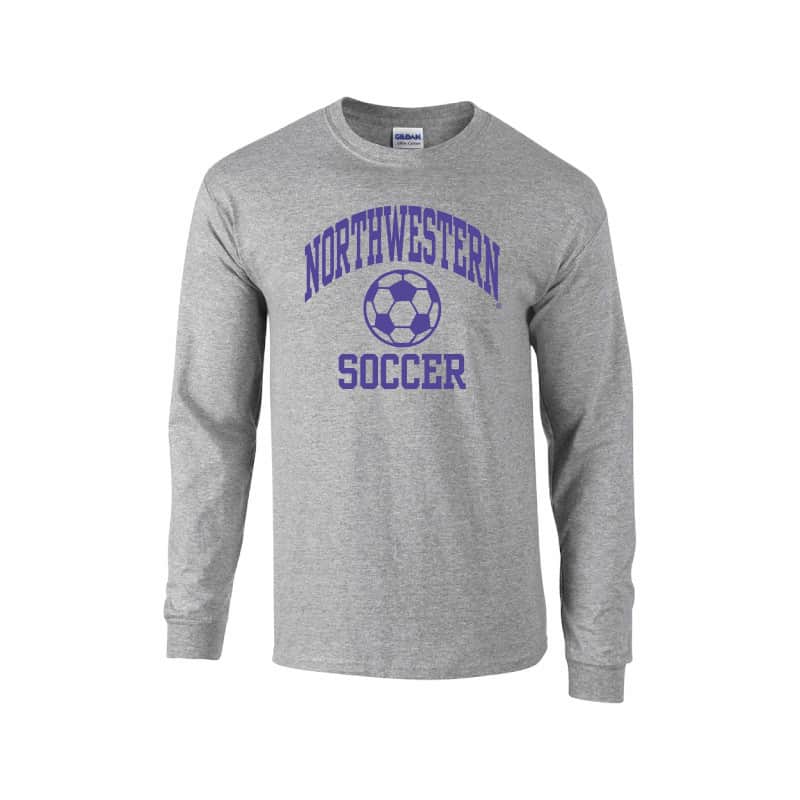 Northwestern University Wildcats Grey Long Sleeve Tee Shirt with Soccer Design