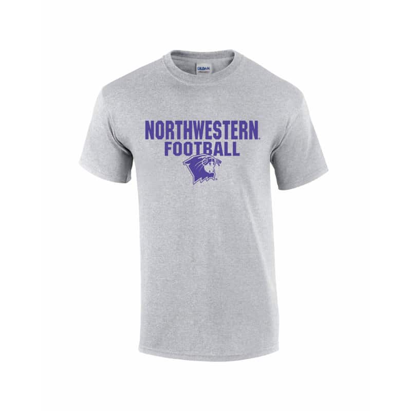 Northwestern University Wildcats Grey Short Sleeve Tee Shirt with Football Wildcat Design