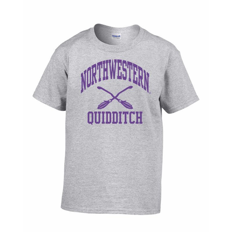 Northwestern University Wildcats Grey Short Sleeve Tee Shirt with Quidditch Design