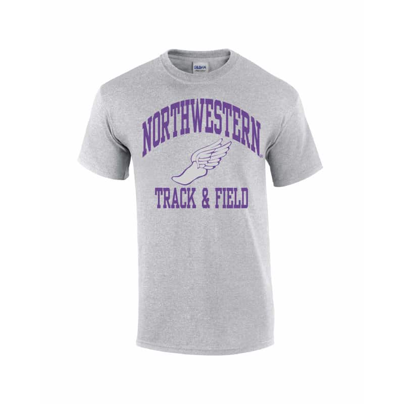 Northwestern University Wildcats Grey Short Sleeve Tee Shirt with Track & Field Design