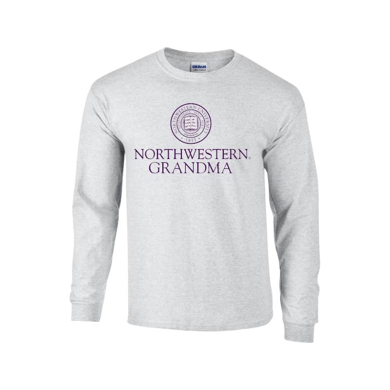 Northwestern University Wildcats Light Grey Long Sleeve Tee Shirt with Grandma Design