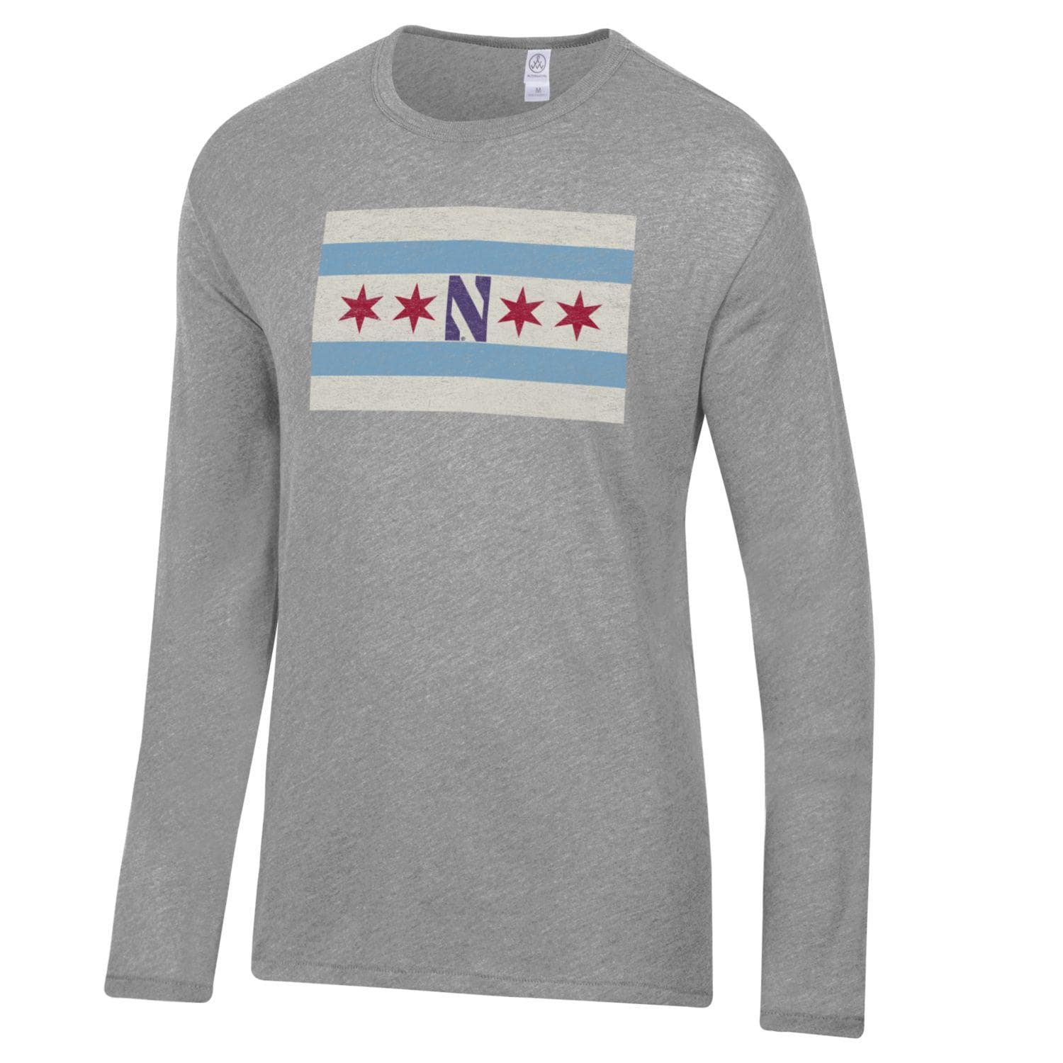 Northwestern University Wildcats Men’s Alternative Apparel The Keeper Smoke Grey Long Sleeve Tee Shirt with Chicago Flag Design