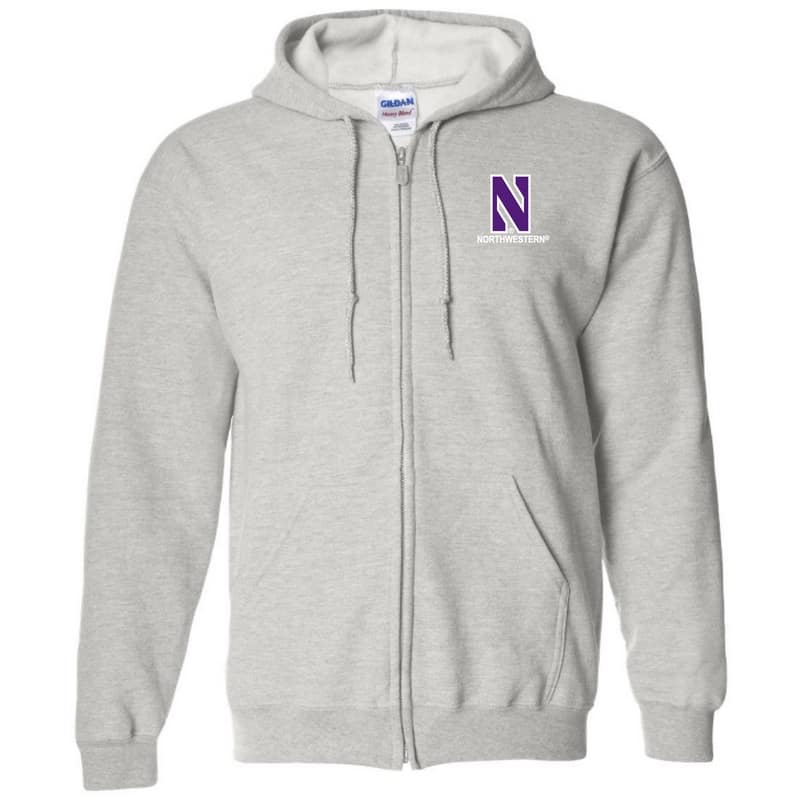 Men’s Ash Grey Full-Zip Hooded Sweatshirt with Left Chest Embroidered Stylized N & Northwestern Design