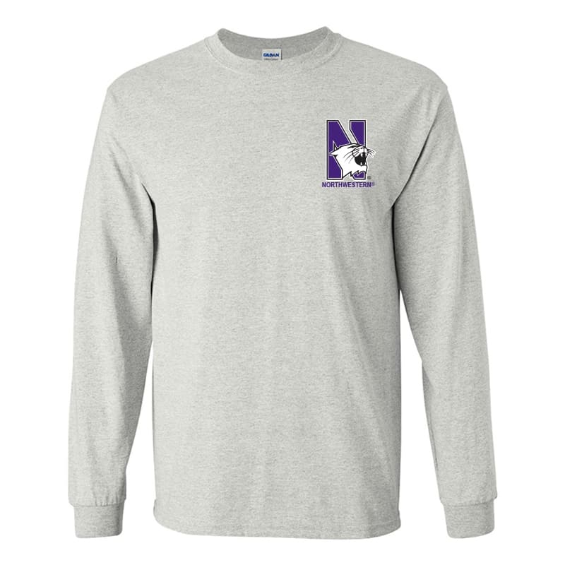Northwestern University Wildcats Men’s Ash Grey Long Sleeve Tee Shirt with Left Chest Embroidered N-Cat & Northwestern Design
