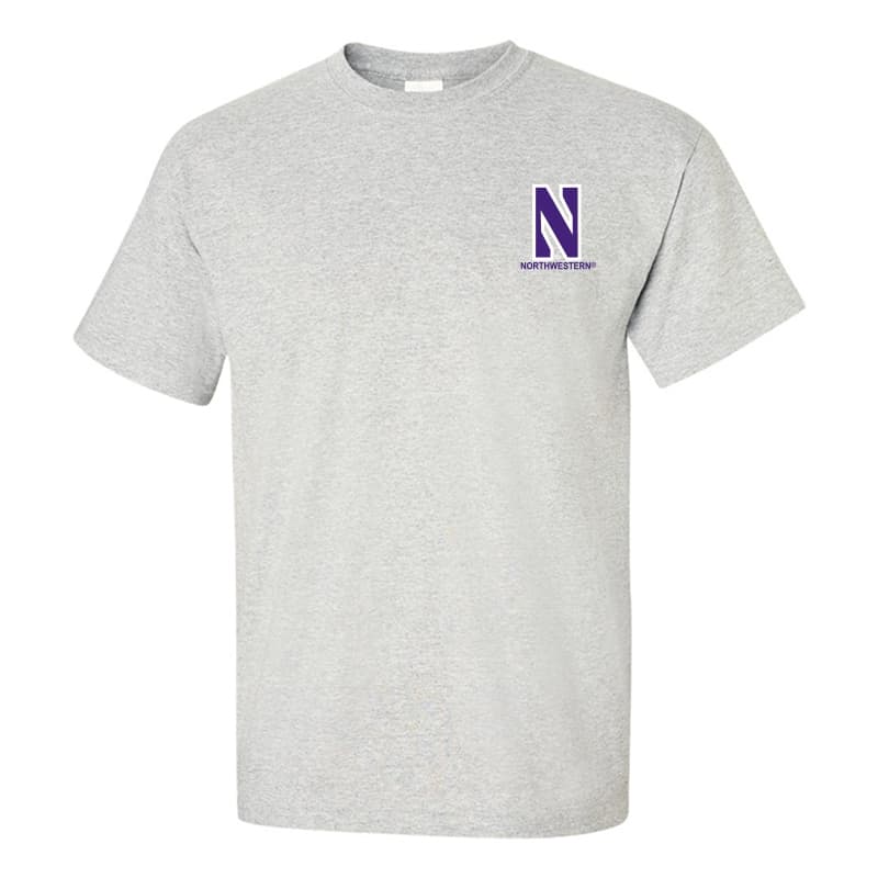 Men’s Ash Grey Short Sleeve Tee Shirt with Left Chest Embroidered Stylized N & Northwestern Design