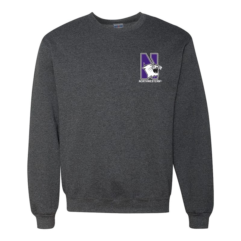 Northwestern University Wildcats Men’s Black Heather Crewneck Sweatshirt with Left Chest Embroidered N-Cat & Northwestern Design