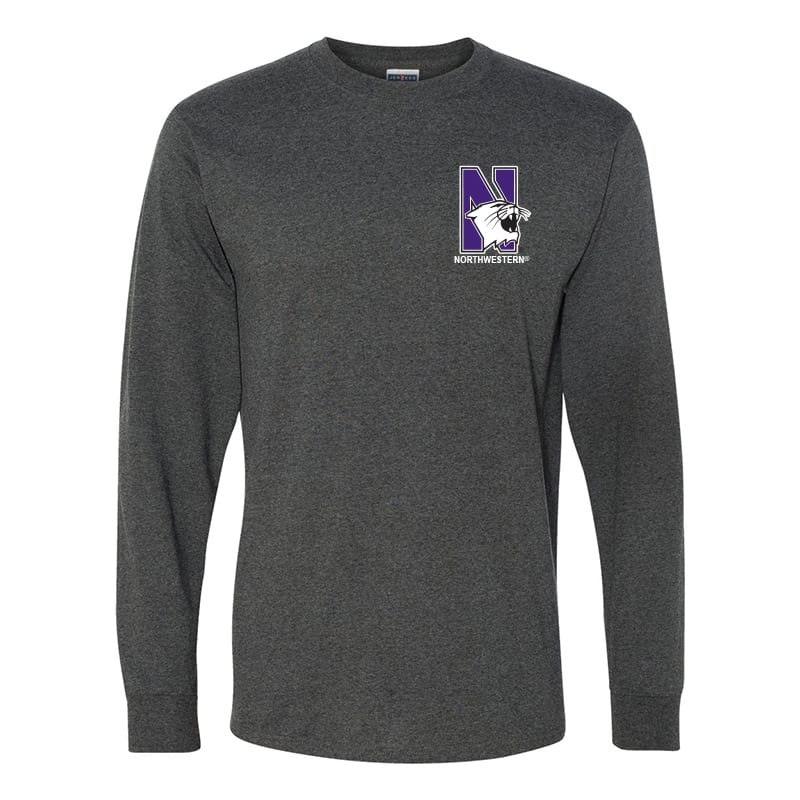 Northwestern University Wildcats Men’s Black Heather Long Sleeve Tee Shirt with Left Chest Embroidered N-Cat & Northwestern Design