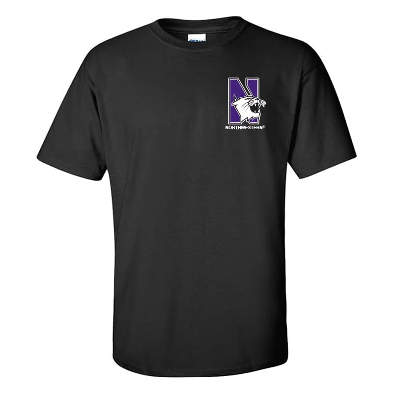 Northwestern University Wildcats Men’s Black Short Sleeve Tee Shirt with Left Chest Embroidered N-Cat & Northwestern Design