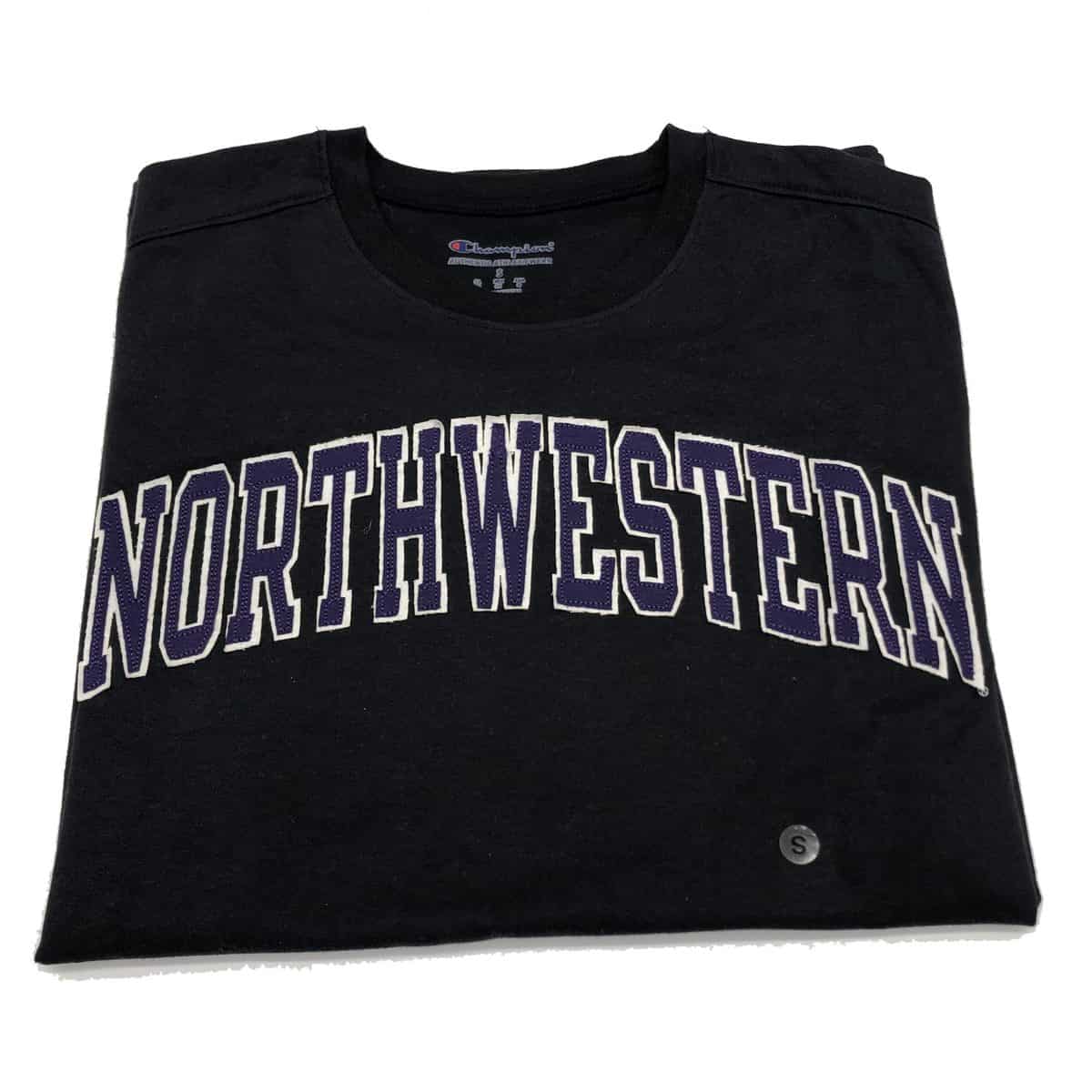 Northwestern University Wildcats Men’s Black Short Sleeve Tee Shirt with Vintage Appliqué Arched Northwestern Design