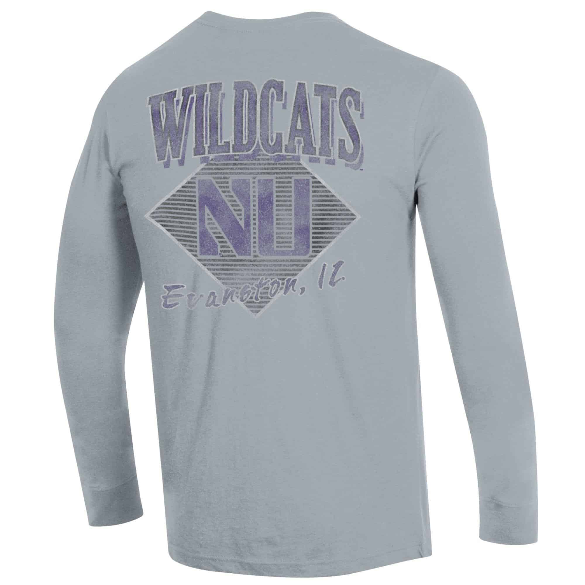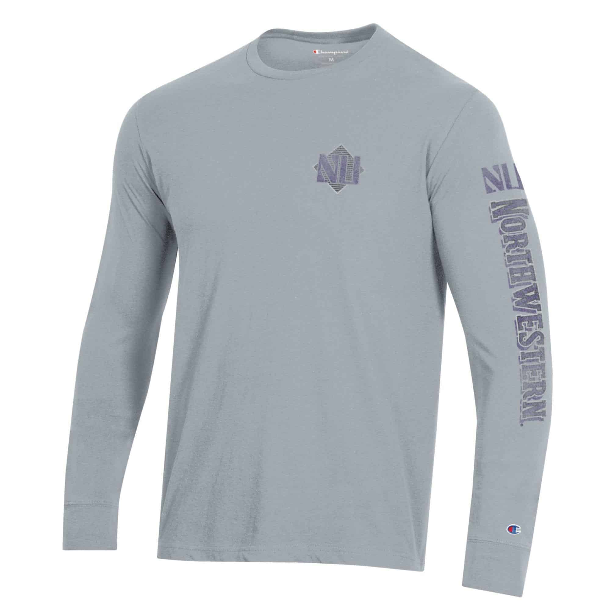 Northwestern University Wildcats Men’s Champion Heather Grey Long Sleeve Tee Shirt with Three Location Faded Print