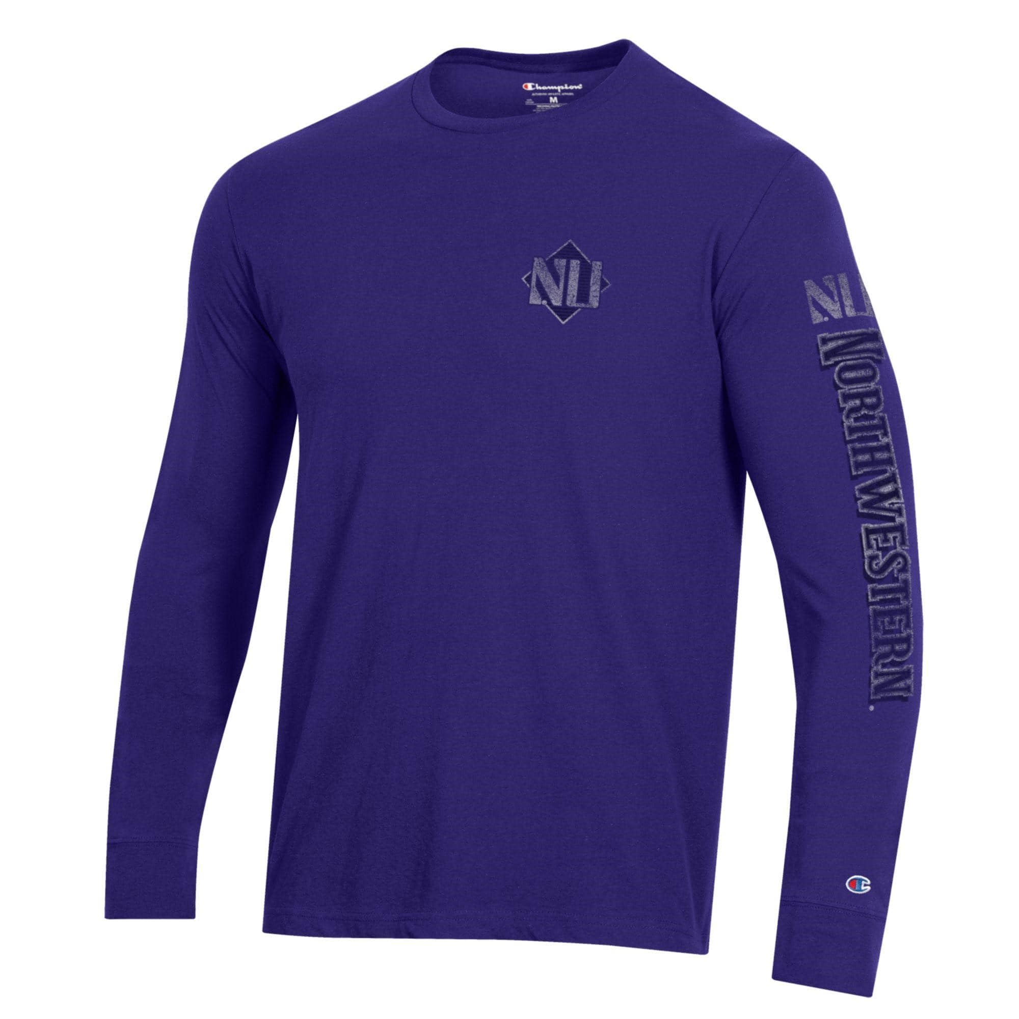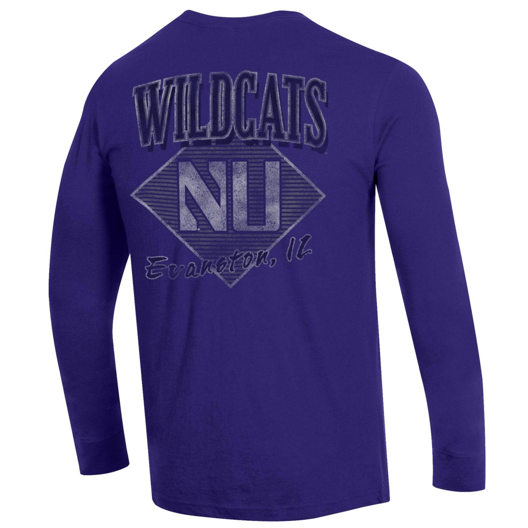 Northwestern University Wildcats Men’s Champion Purple Long Sleeve Tee Shirt with Three Location Faded Print