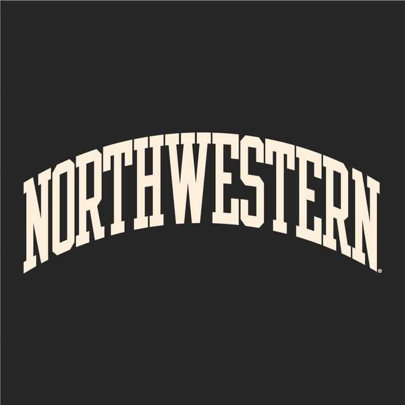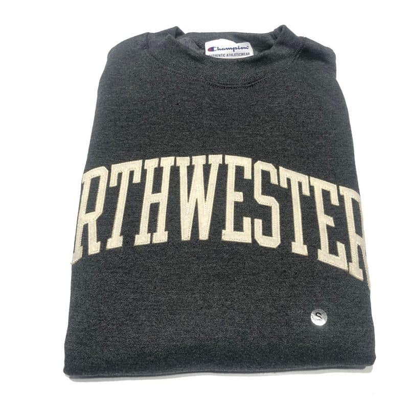 Northwestern University Wildcats Men’s Granite Heather Champion Eco Powerblend Crewneck Sweatshirt with Antique Creamy White Arched Northwestern Wool Sewn Appliqué Design