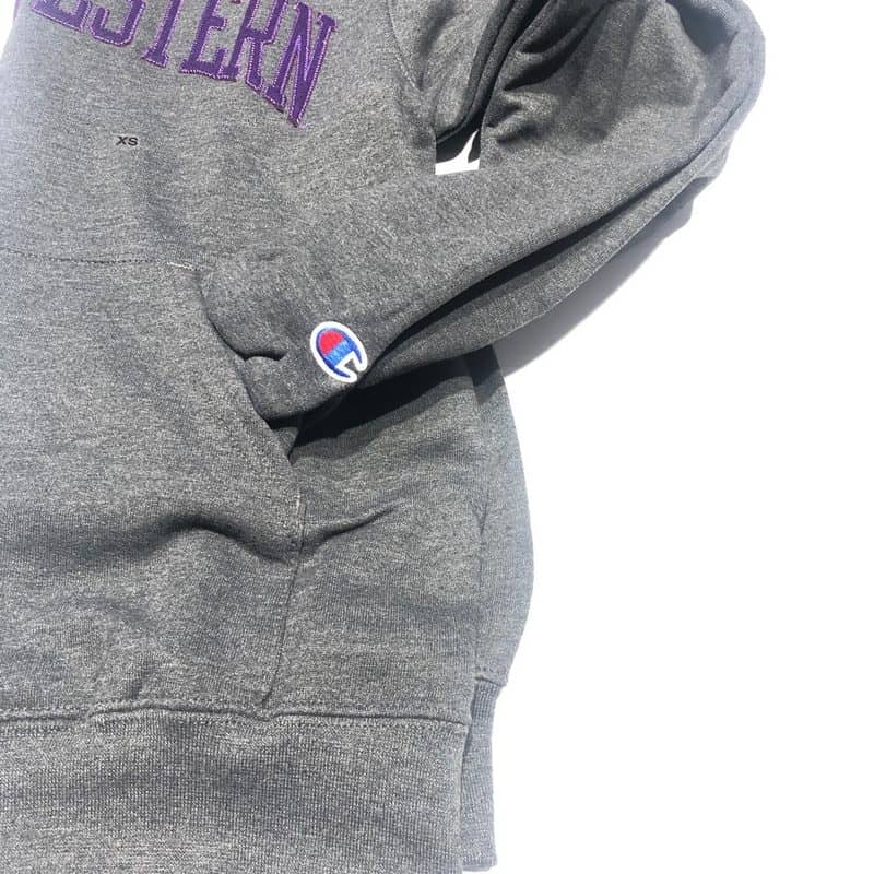 Northwestern University Wildcats Men’s Granite Heather Champion Eco Powerblend Hooded Sweatshirt with Purple Arched Northwestern Wool Sewn Appliqué Design