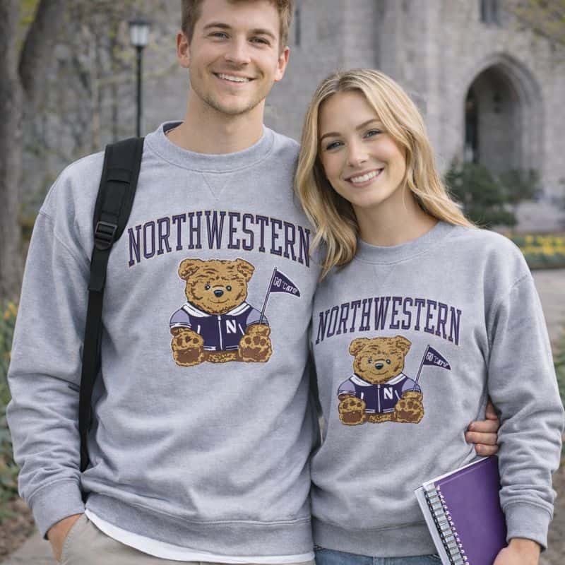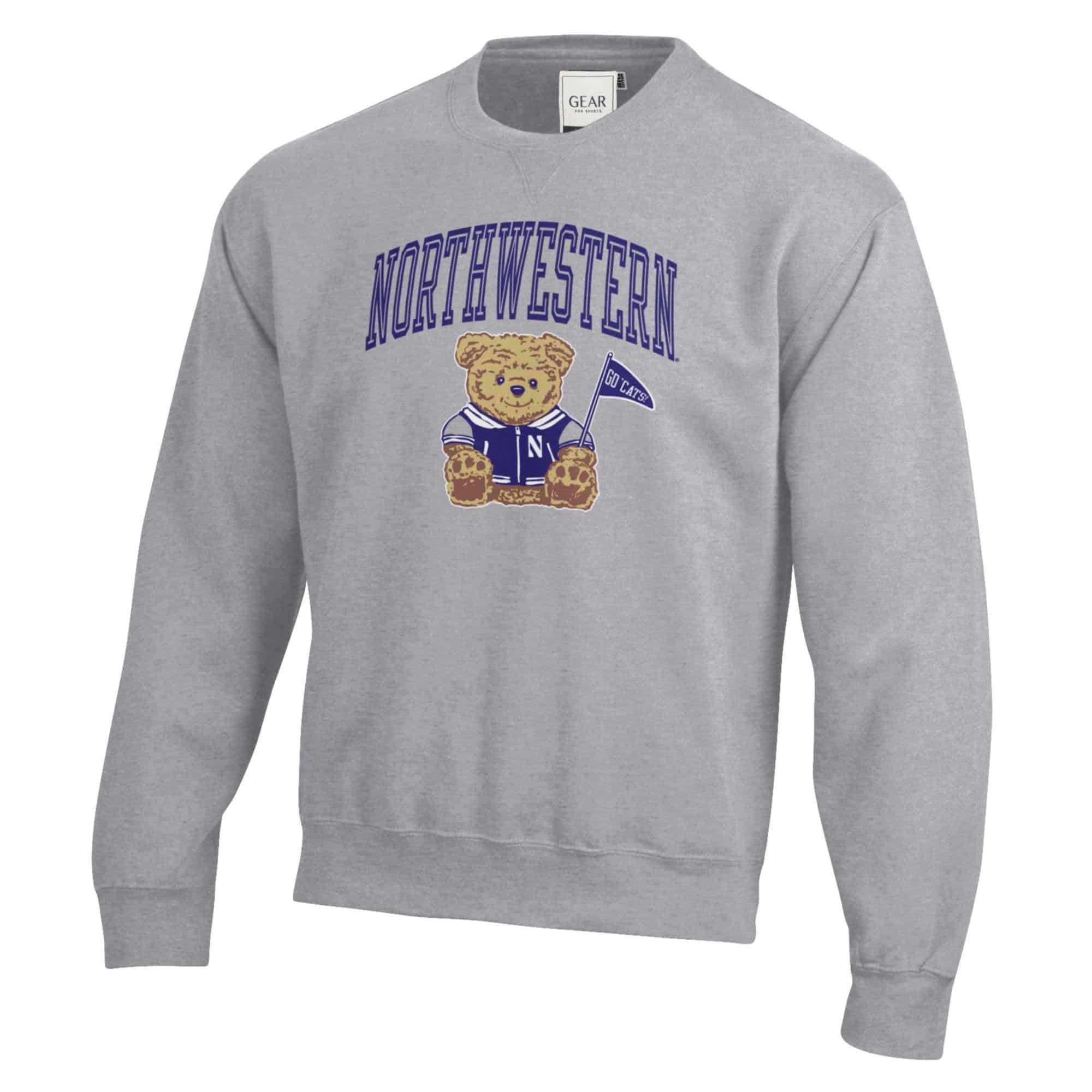 Northwestern University Wildcats Men’s Grey Crewneck Sweatshirt with Sitting Bear Design