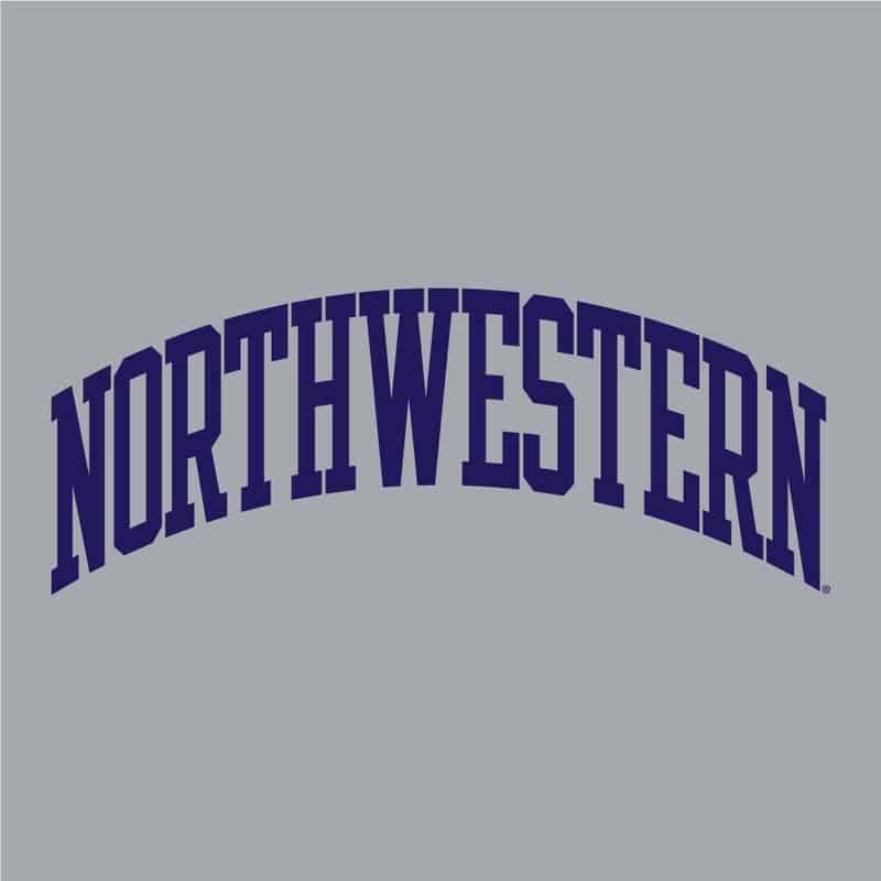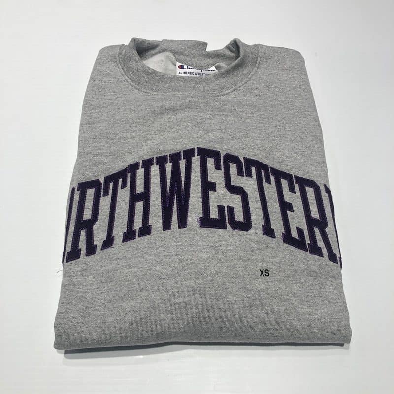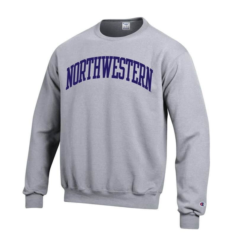 Northwestern University Wildcats Men’s Heather Grey Champion Eco Powerblend Crewneck Sweatshirt with Purple Arched Northwestern Wool Sewn Appliqué Design