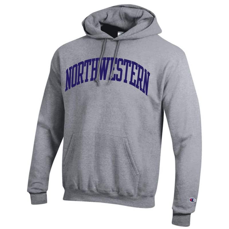 Northwestern University Wildcats Men’s Heather Grey Champion Eco Powerblend Hooded Sweatshirt with Purple Arched Northwestern Wool Sewn Appliqué Design