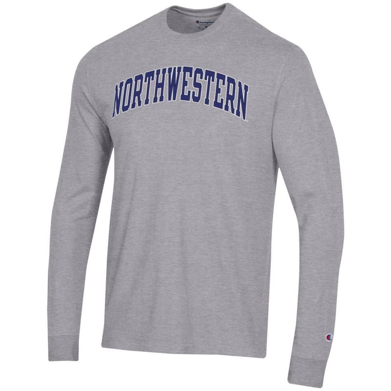 Northwestern University Wildcats Men’s Heritage Grey Long Sleeve Tee Shirt with Vintage Appliqué Arched Northwestern Design