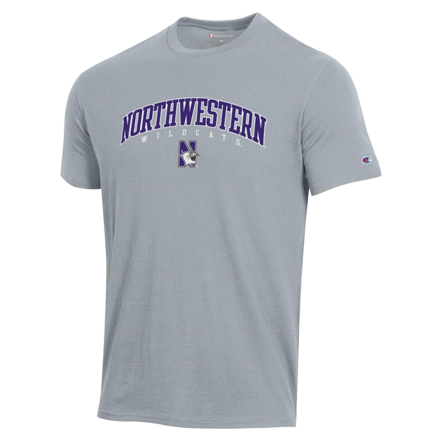 Northwestern University Wildcats Men’s Heritage Grey Short Sleeve Tee Shirt with Vintage Appliqué Arched Northwestern Over N-Cat Design