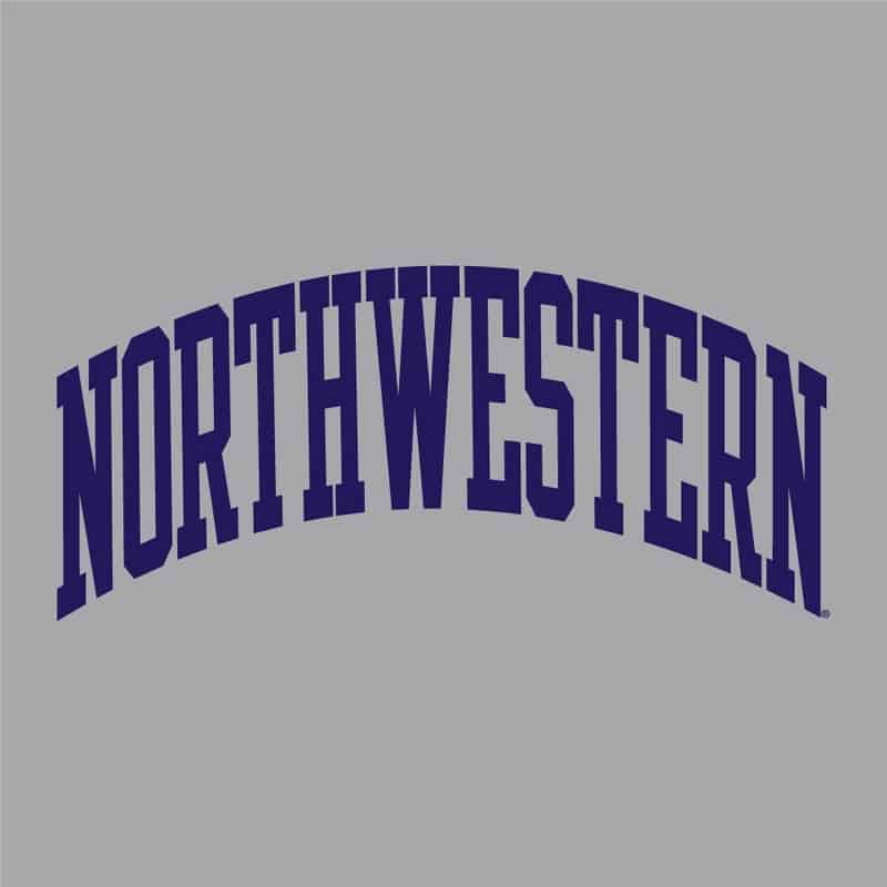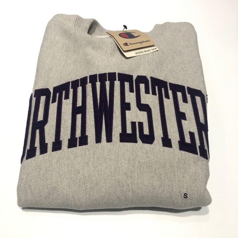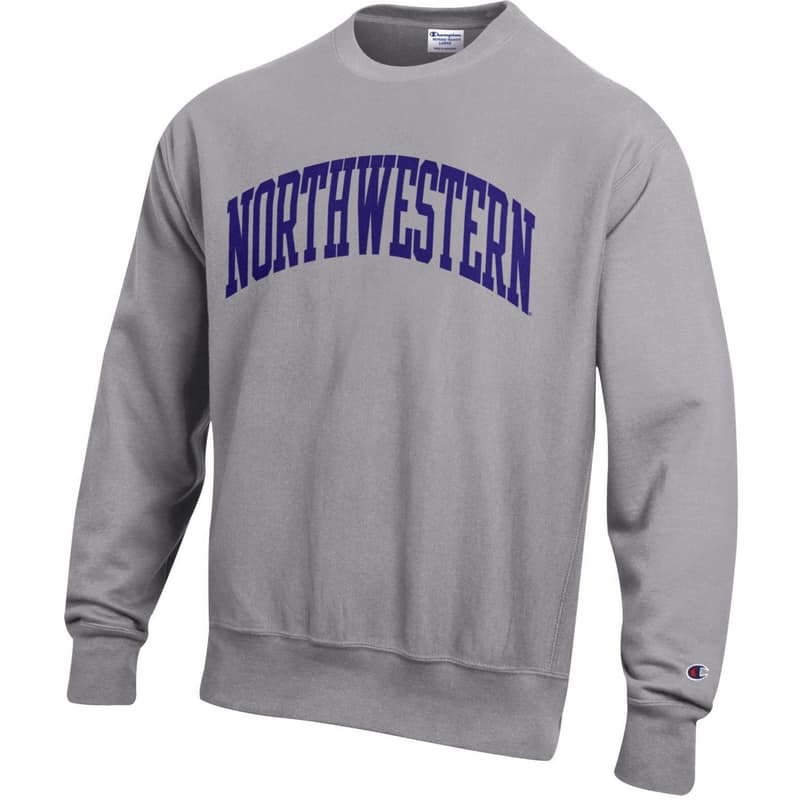 Northwestern University Wildcats Men’s Oxford Heather Champion Super Heavy Reverse Weave Crewneck Sweatshirt with Purple Arched Northwestern Wool Sewn Appliqué Design