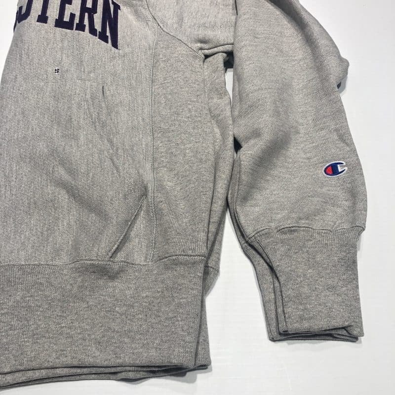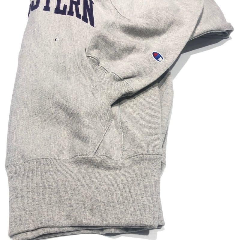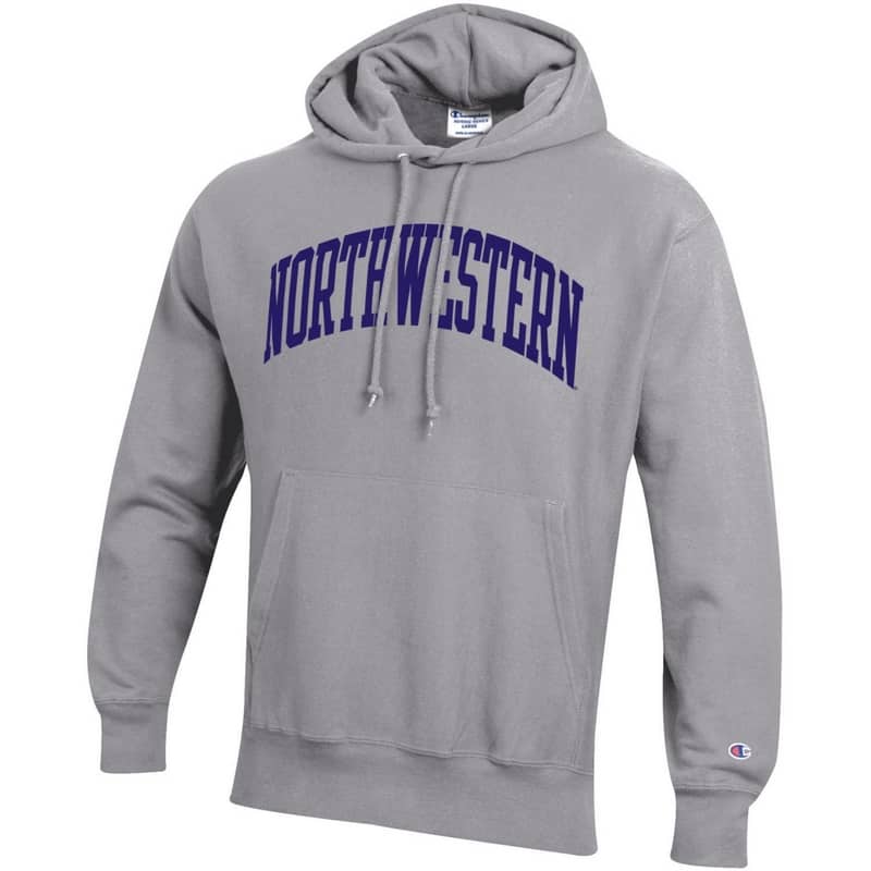 Northwestern University Wildcats Men’s Oxford Heather Champion Super Heavy Reverse Weave Hooded Sweatshirt with Purple Arched Northwestern Wool Sewn Appliqué Design