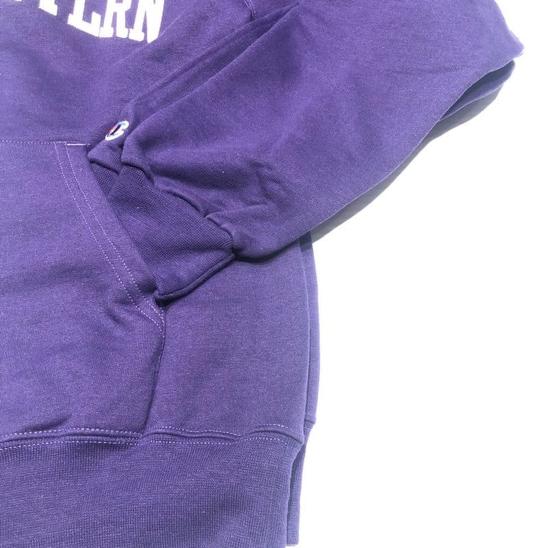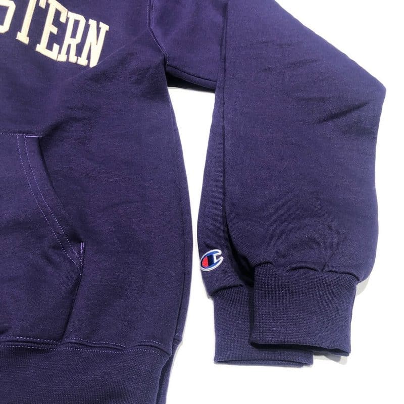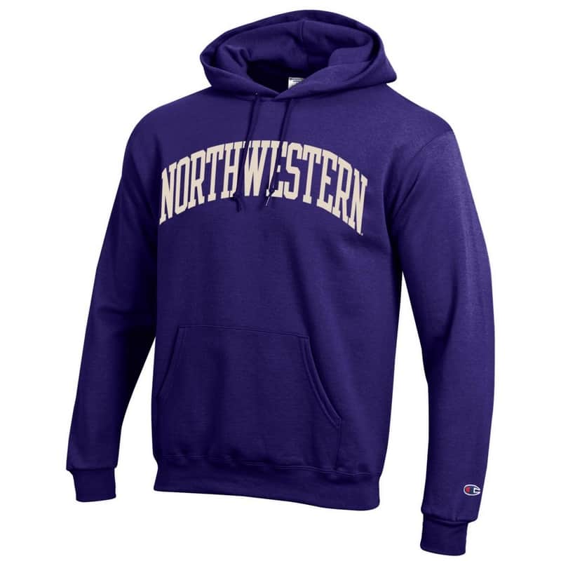 Northwestern University Wildcats Men’s Purple Champion Eco Powerblend Hooded Sweatshirt with Antique Creamy White Arched Northwestern Wool Sewn Appliqué Design
