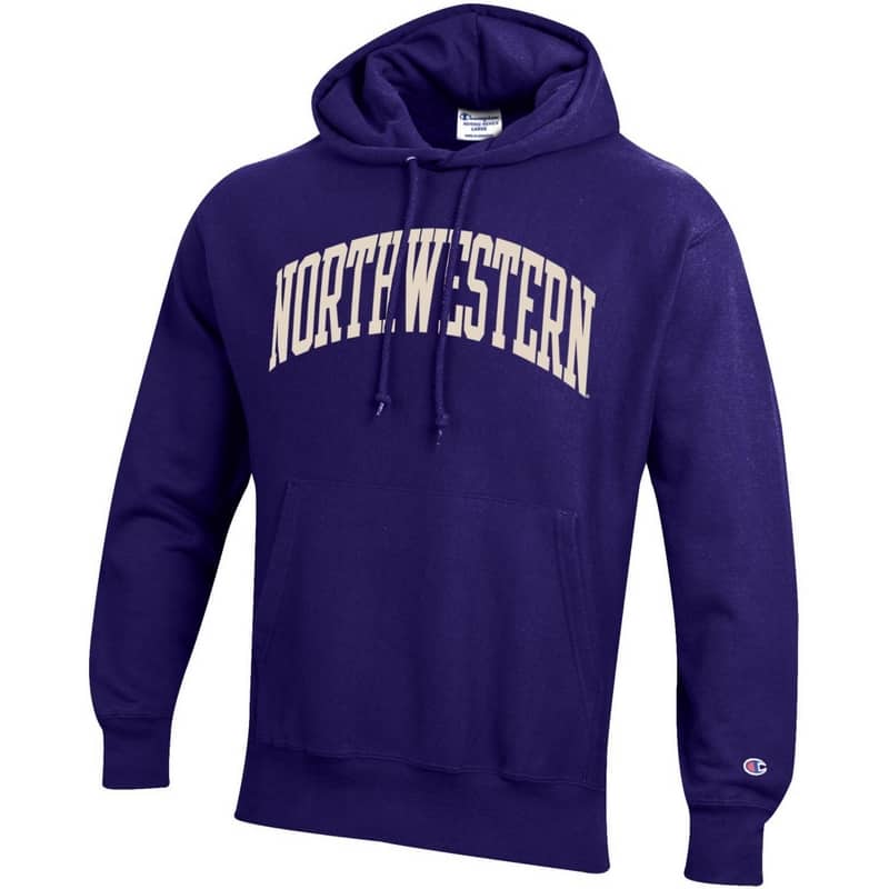 Northwestern University Wildcats Men’s Purple Champion Super Heavy Reverse Weave Hooded Sweatshirt with Antique Creamy White Arched Northwestern Wool Sewn Appliqué Design