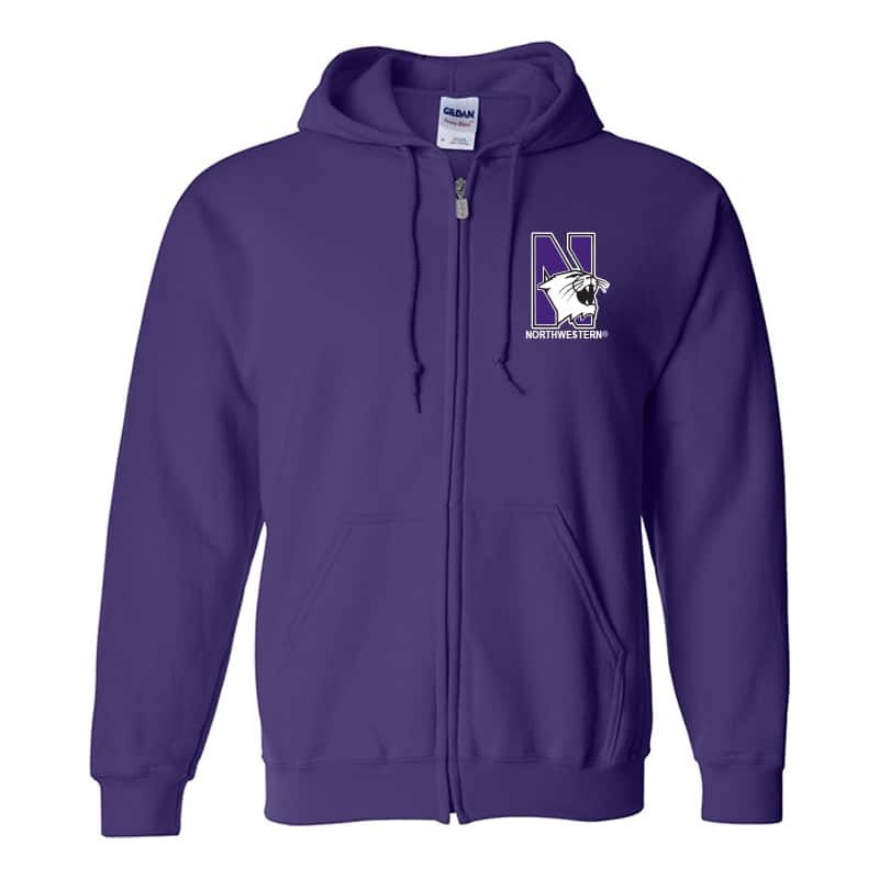 Northwestern University Wildcats Men’s Purple Full-Zip Hooded Sweatshirt with Left Chest Embroidered N-Cat & Northwestern Design