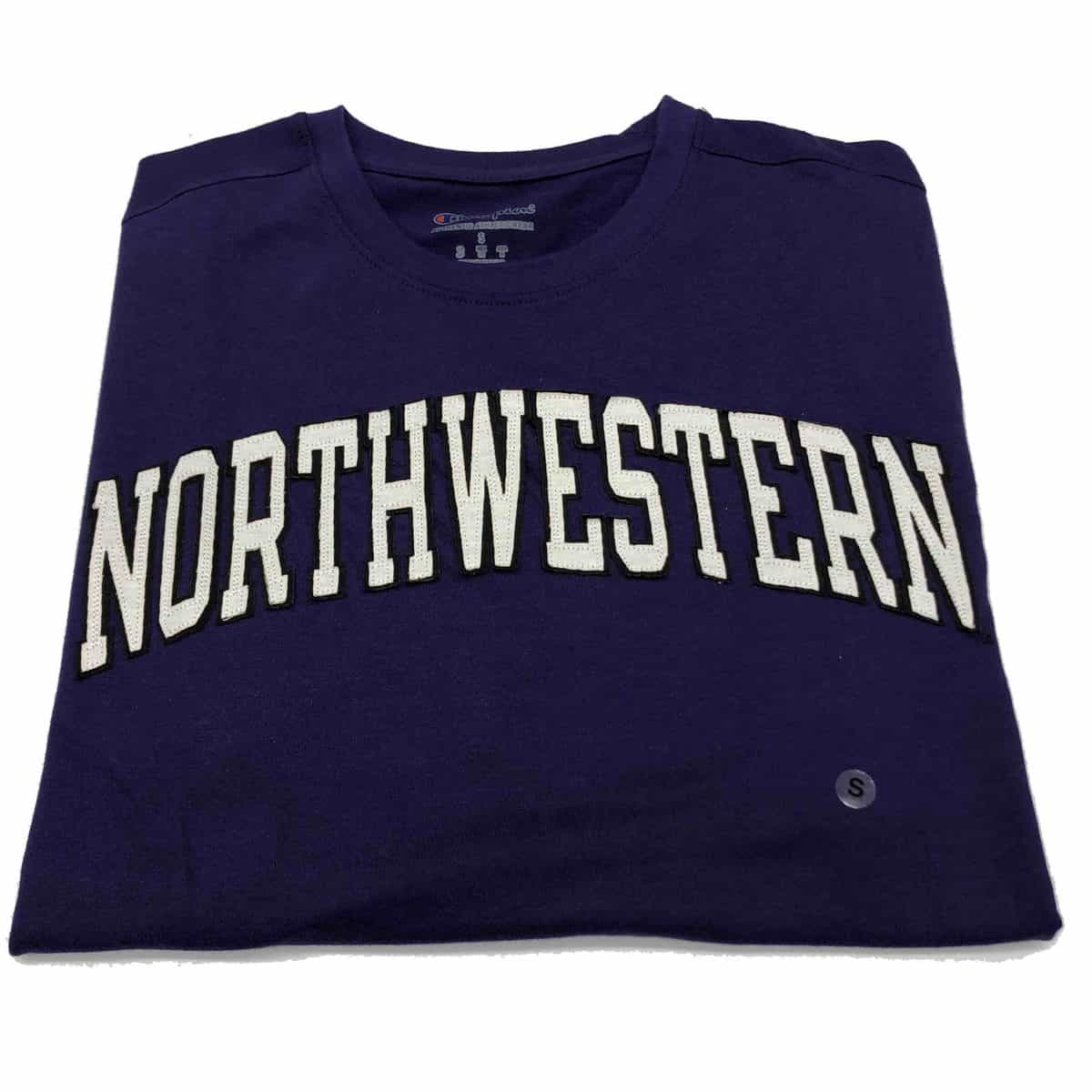 Northwestern University Wildcats Men’s Purple Long Sleeve Tee Shirt with Vintage Appliqué Arched Northwestern Design