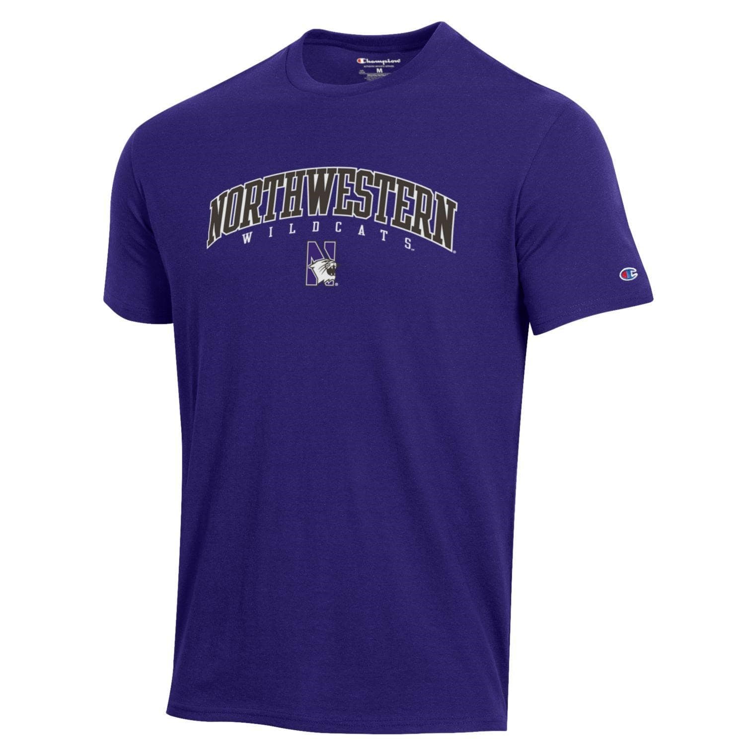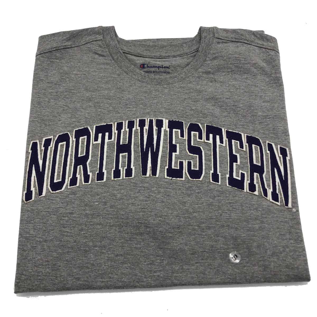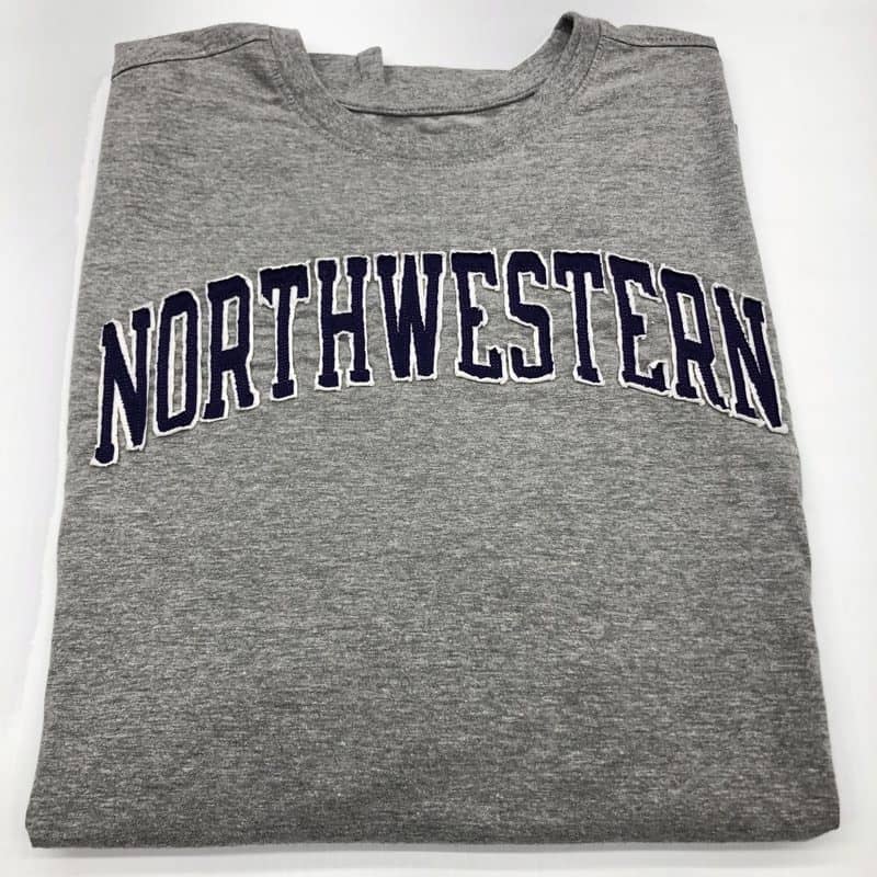 Northwestern University Wildcats Men’s Purple Short Sleeve Tee Shirt with Vintage Appliqué Arched Northwestern Over N-Cat Design