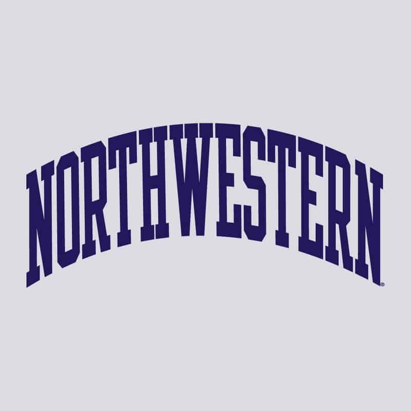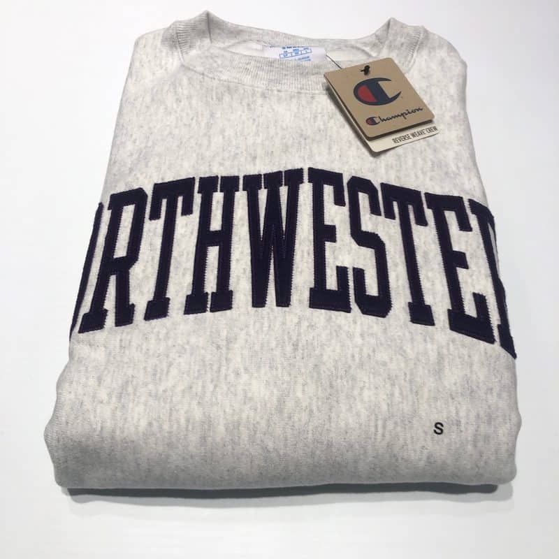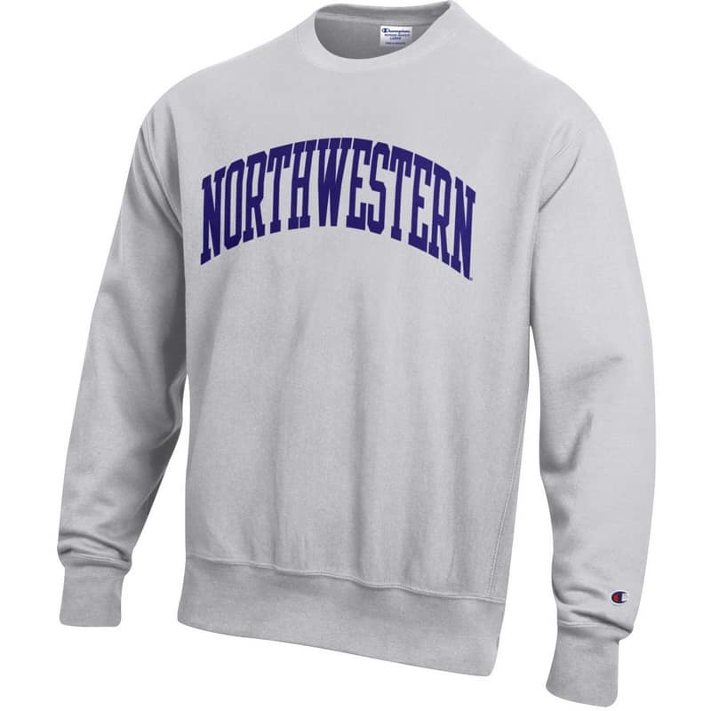 Northwestern University Wildcats Men’s Silver Grey Champion Super Heavy Reverse Weave Crewneck Sweatshirt with Purple Arched Northwestern Wool Sewn Appliqué Design