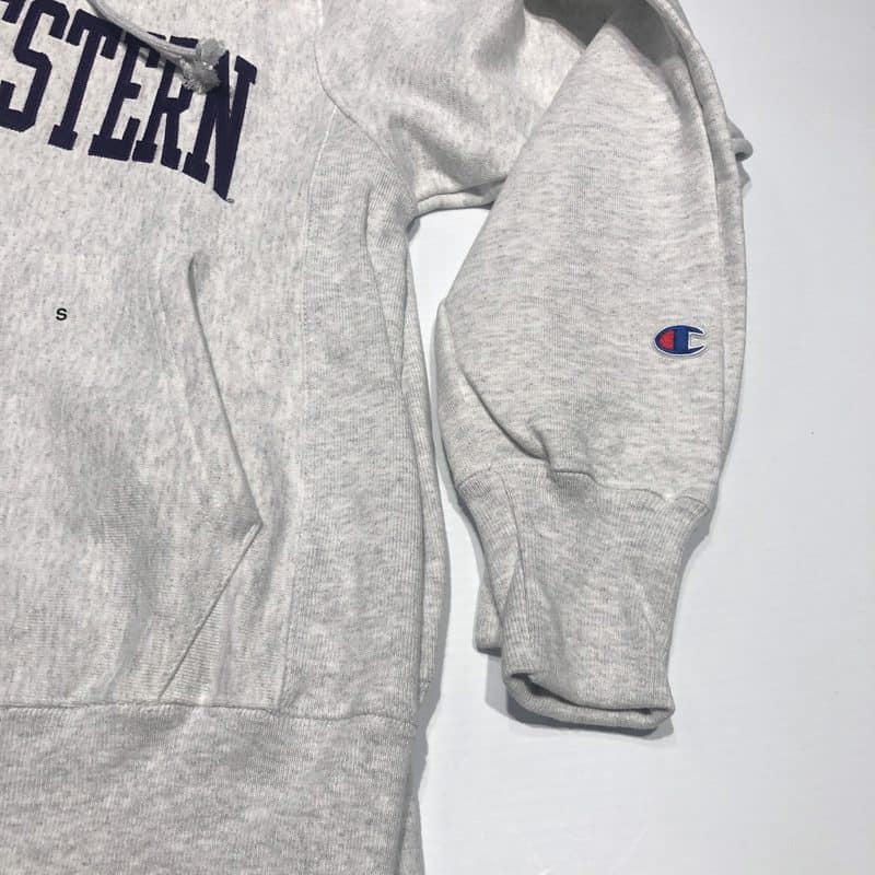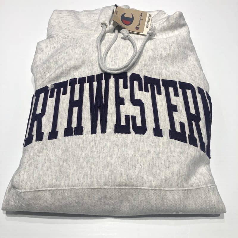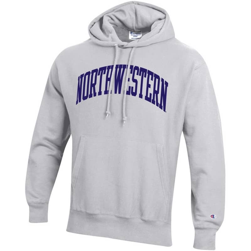 Northwestern University Wildcats Men’s Silver Grey Champion Super Heavy Reverse Weave Hooded Sweatshirt with Purple Arched Northwestern Wool Sewn Appliqué Design