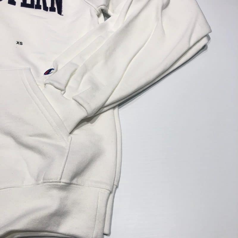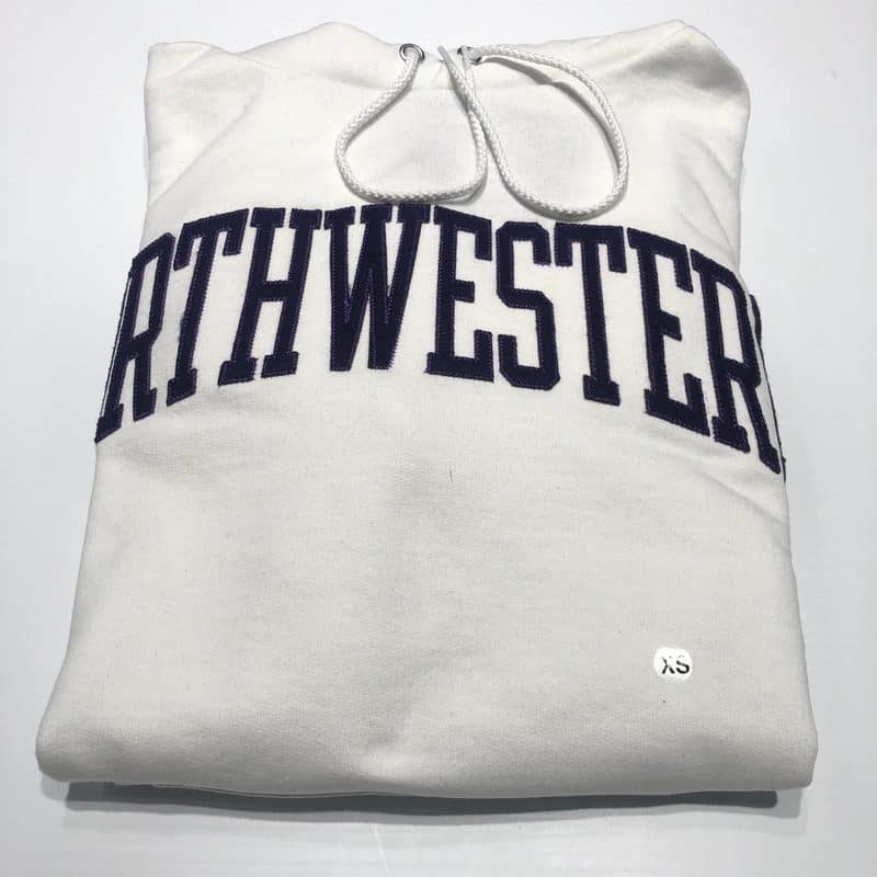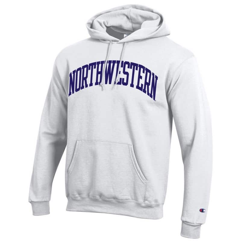 Northwestern University Wildcats Men’s White Champion Eco Powerblend Hooded Sweatshirt with Purple Arched Northwestern Wool Sewn Appliqué Design